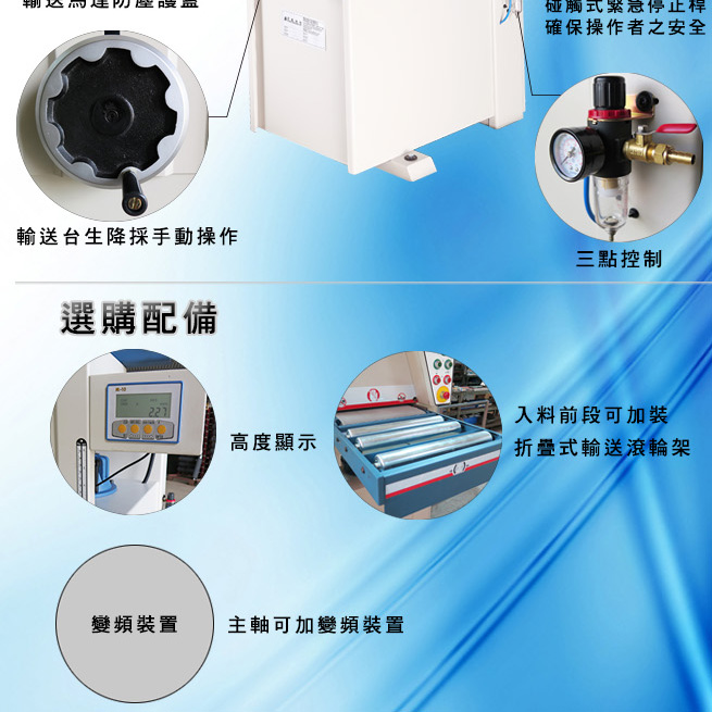 - 穀輪增加磨砂能力,壓板式可降低磨砂表面砂帶接痕。